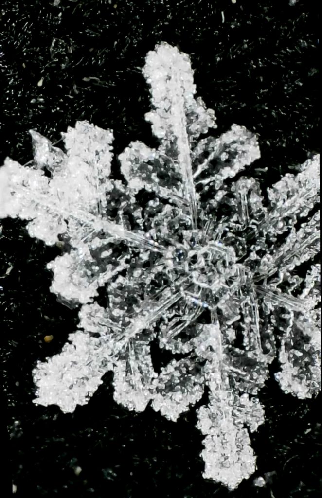 Tämän lumihiutaleen kuvasin mikroskooppikameralla. Tosin lumihiutale on niin pieni, että yhden ruudun syväterävyysalueesta tulee aivan liian lyhyt. Siksi olen koonnut tämänkin kuvan useasta ruudusta pinoamalla, Photoshopissa.